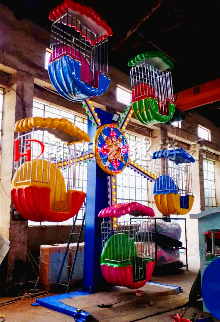 儿童观览车也叫母子观览车,就像一个小型的摩天轮一样,有五个造型像小房子的座舱,色彩搭配鲜明,非常吸引人的目光。设备运行起来后,游客随着座舱的丝瓜黄色成人缓缓升到空中,再慢慢降落到地面,非常好玩。该设备占地面积小,投入成本低,是公园、小型游乐场、景区的很好选择。